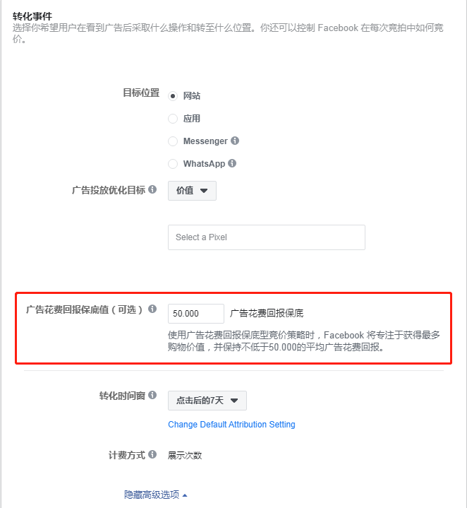 如果不输入广告花费回报控制,Facebook系统将使用最高价值竞价策略。如果输入保底广告花费回报控制金额时,可在确保广告花费回报 (ROAS) 超 过所输入竞价的同时,实现广告花费回报 (ROAS) 的最大化。相较于优化转化量而言,优化价值可能会提高单次成效的平均费用。值得注意的是,这种优化方案会在预算范围内寻找会带来最多收入的购物转化,而不是寻找花费最少的购物转化。