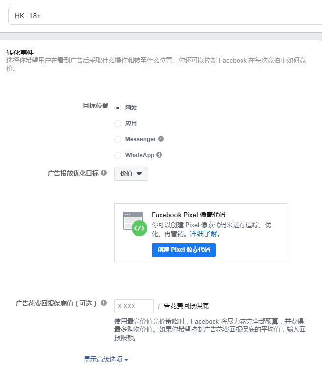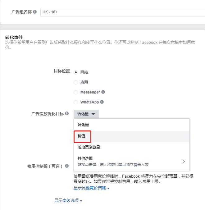 进入Facebook BM管理后台,广告目标选择转化量,在广告组层级选择价值即可。