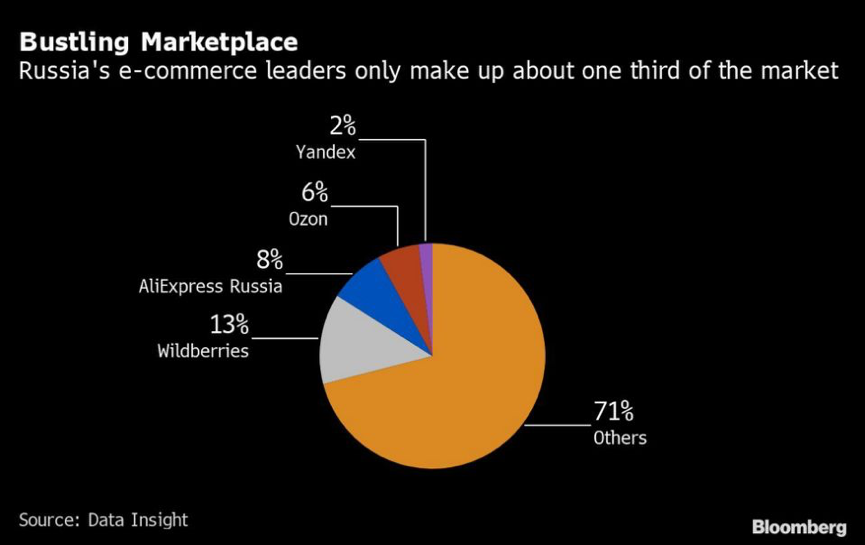 同中美两国不同,俄罗斯的电商平台仍然处在起步阶段,玩家众多,但还没有形成绝对的领跑者。该国最大的在线零售商 Wildberries(野莓)即使在2020年前九个月零售额翻番后,也不过控制了13%的市场份额。而相比之下,亚马逊在美国占有约一半左右的市场份额。