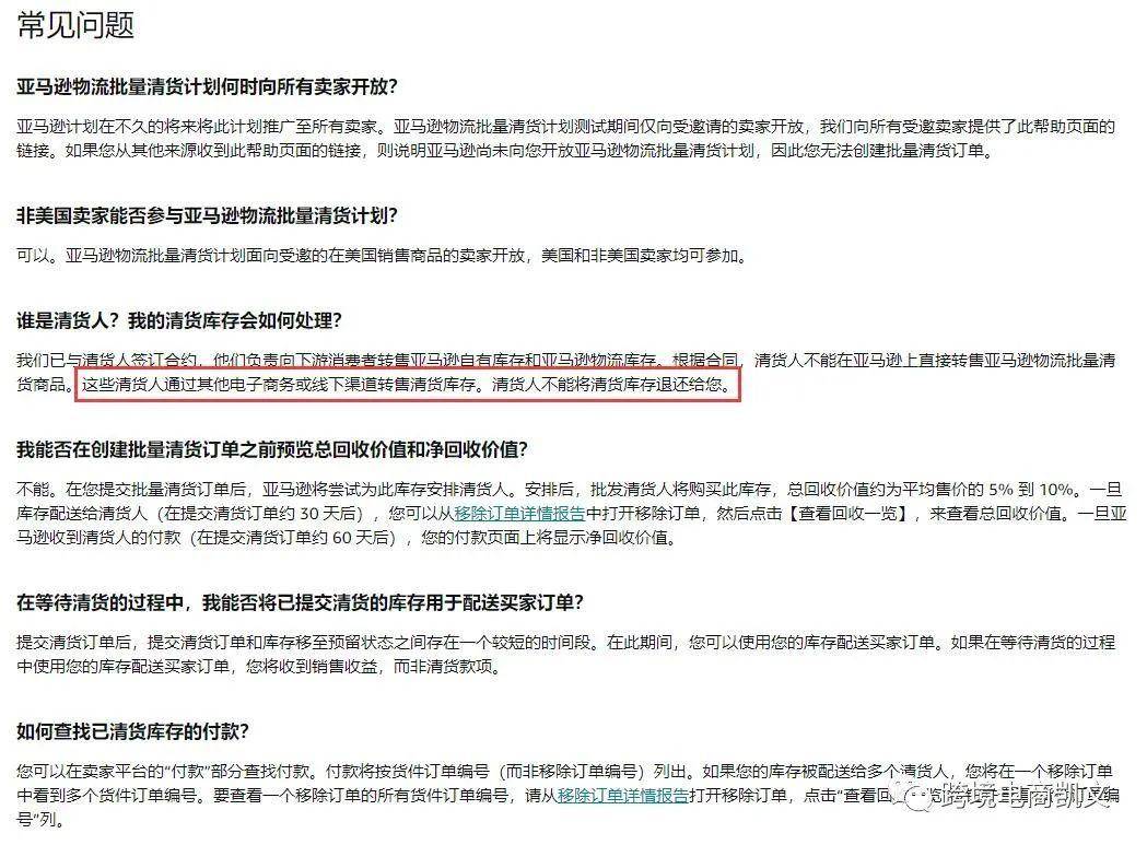 亚马逊已与清货人签订合约,这些清货人通过其他电子商务或线下渠道转售清货库存,清货人不能将清货库存退还给卖家。