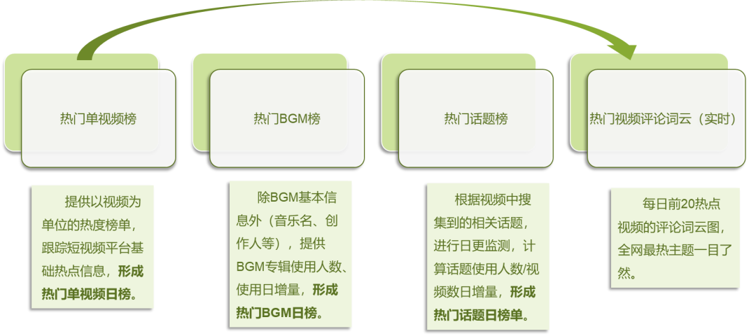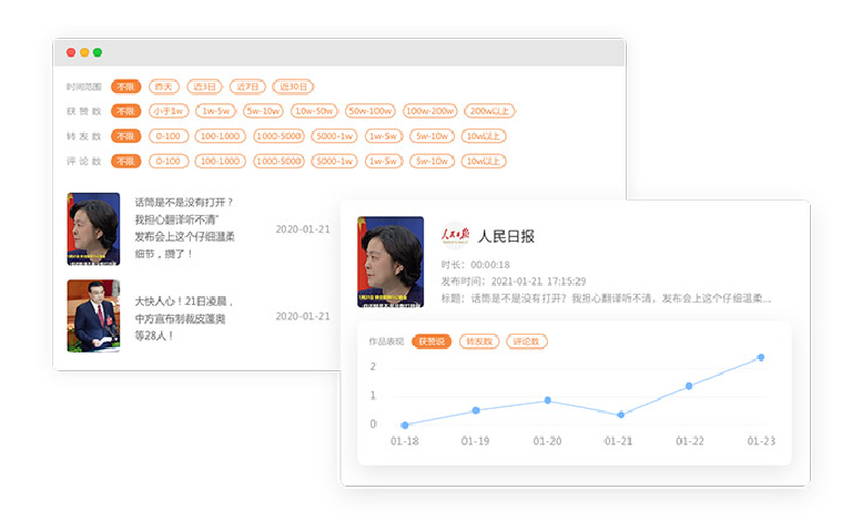 针对创作者发布原创性内容,就其传播能力、影响力进行全面分析。首先针对内容传播趋势及周期进行实时监控,包括其传播效果数据及其走势、关键节点(如爆点)的声量效果,系列性视频、挑战参与者标签等,并进行智能评估;其次,针对内容舆情的传播进行监测,对于用户评论与反馈,传播期间账号的粉丝量变化等进行实时监测;第三,针对内容进行跨平台影响力评估,针对内容跨平台分享、转载、二创情况的监测,并形成联动宣传活动的策略输出。