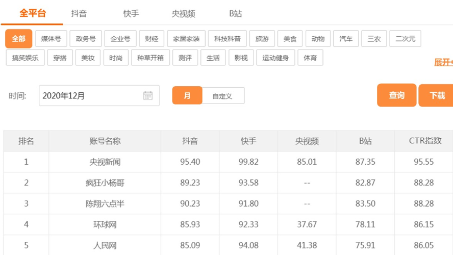 基于账号分发,可实现4大平台同账号数据打通,综合评估账号在多平台的传播效果,形成CTR短视频指数榜单。此榜单是基于账号在所有监测平台的粉丝规模、内容发布与传播效果、变现等不同维度数据通过科学算法综合得出,用于综合评估账号影响力,目前应用于媒体号、企业号、政务号、财经、家居家装等45个品类,定期形成综合月榜单、季度榜单、年度榜单。
