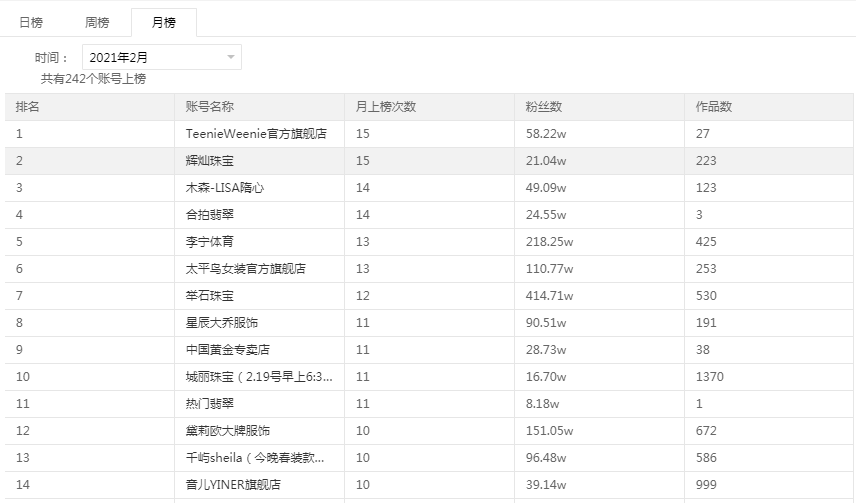 在监测期间,提供基于账号在单平台的单指标传播效果数据排行形成的各类榜单,例如:黑马榜(增粉量排行)、勤奋榜(视频发布量排行)等;基于视频播放量、点赞量等指标形成的热门视频榜,助力视频创作者、管理者发掘优质账号,尽早借鉴学习,知己知彼。