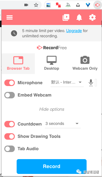 3)其中包含“录制浏览器tab、录制桌面和通过摄像头录制自己”3种模式。其中很值得称赞的是这个小功能: