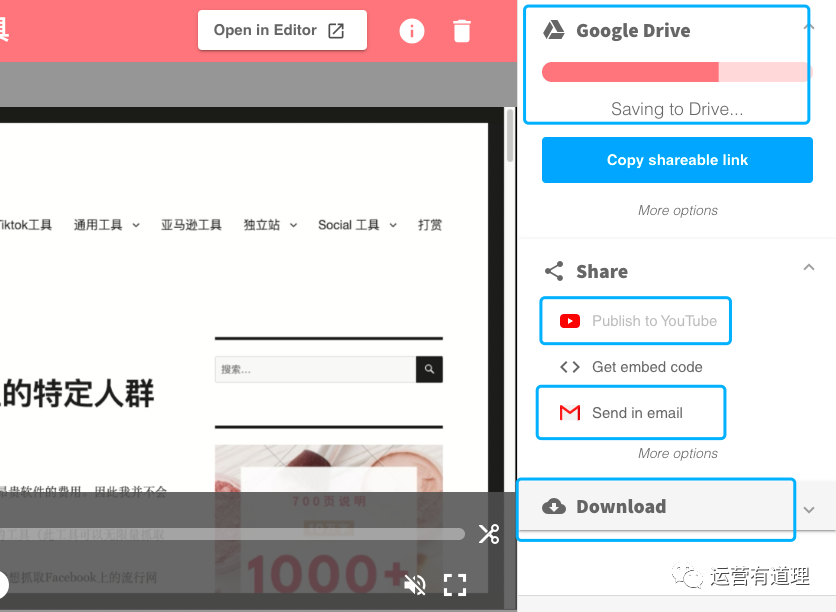 9)点击停止录制后,会进入一个如下图的界面,你可以把录制的视频导出为Mp4格式,或者自动保存到Google Drive、一键发布到Youtube、或者通过gmail发送邮件