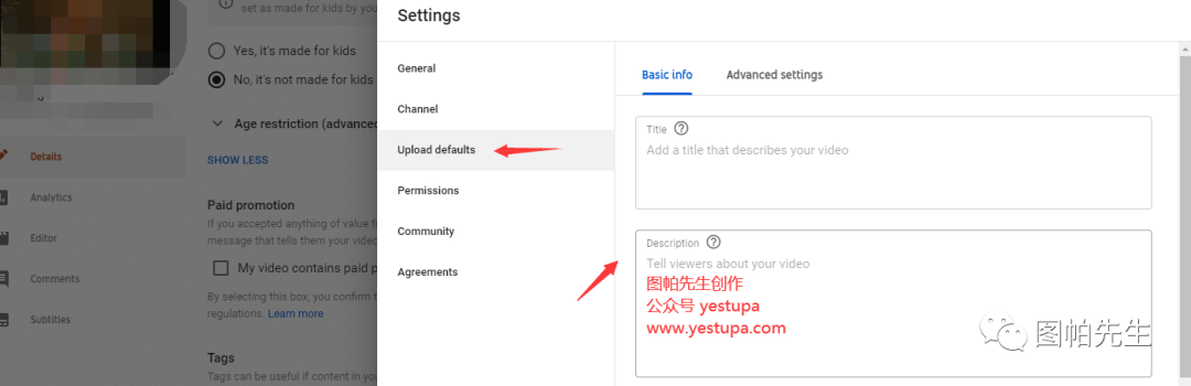 这里我建议使用YouTube上传默认设置功能。这个功能可以节省你的时间,因为你可以设置你的默认信息,未来上传的视频就会自动补充描述了。