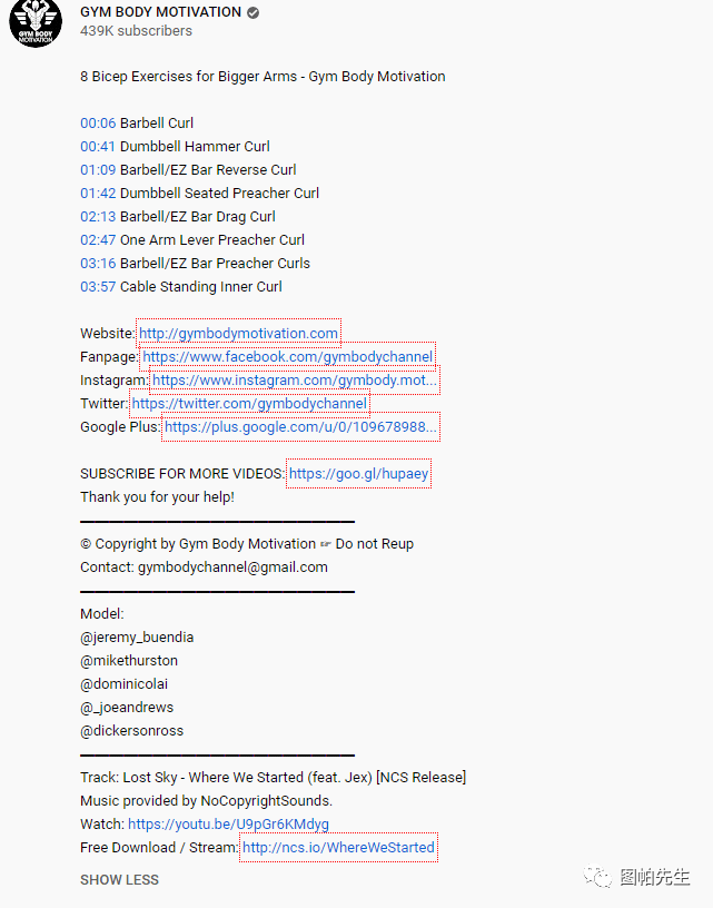 首先,描述的第一句话就有了关键词和简明扼要写出视频内容(当然,如果能写多几句介绍会更好),然后有时间戳,下面就是不同社交渠道的链接,还有订阅链接。