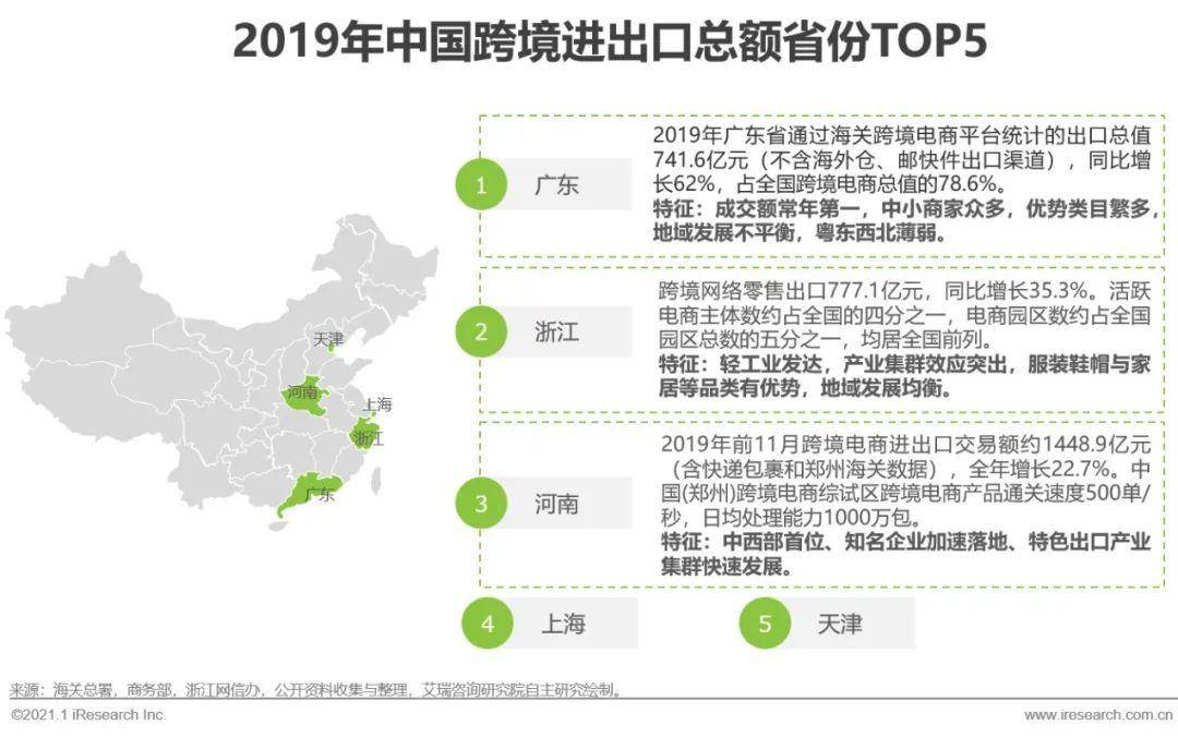 2019年,中国跨境电商零售进出口总额排名前五的省市为:广东省、浙江省、河南省、上海市、天津市。聚焦北美,2019年亚马逊美国站中有36%的活跃卖家来自中国,其中以广东浙江为代表的沿海地区是我国电子类产品和服饰类产业集群地所在,合计占中国卖家的一半以上,广东省有45.5%的中国卖家,浙江省占比10.1%。此外以增速来看,2020年我国民营企业进出口14.98万亿元,增长11.1%,占我国外贸总值的46.6%,比2019年提升了3.9个百分点。