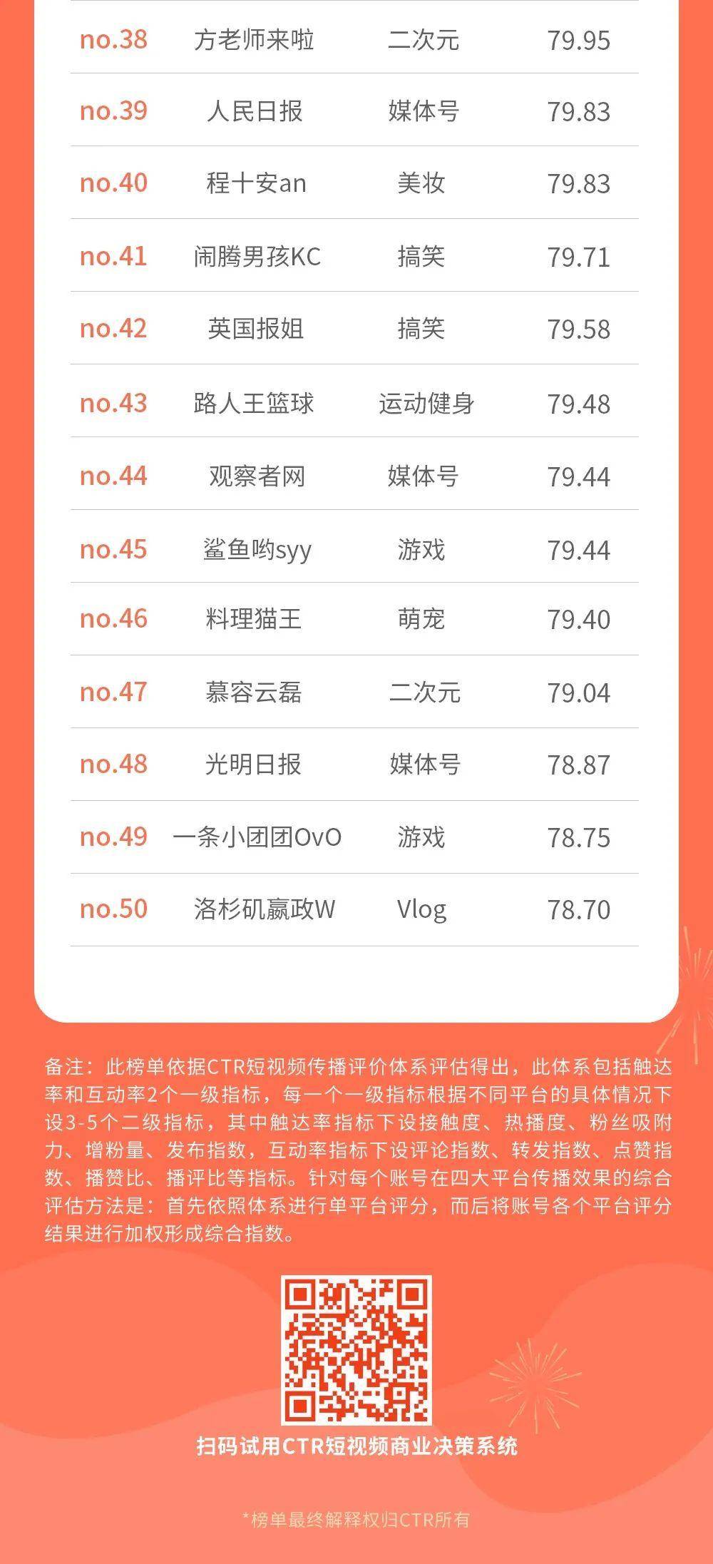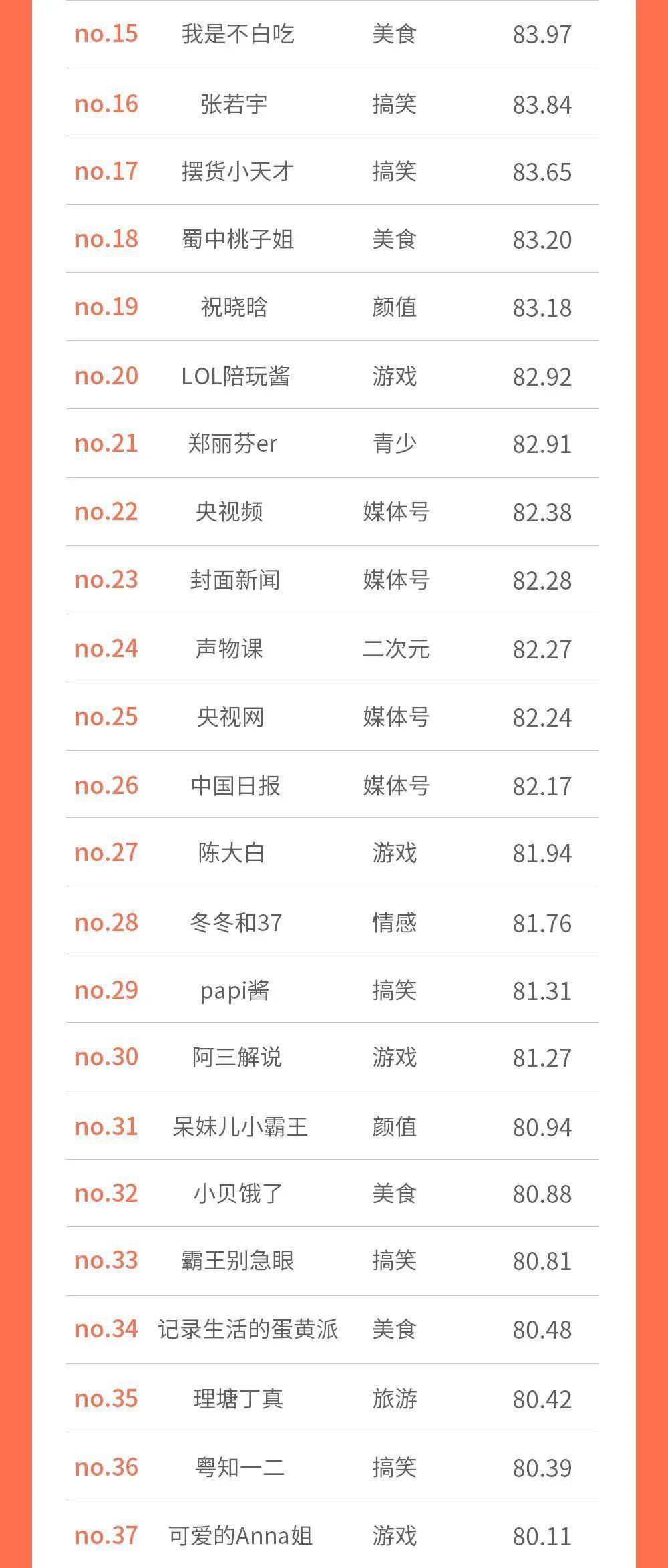 此外,美食、二次元、剧情类、政务类账号也在综合榜中占有一席之地。