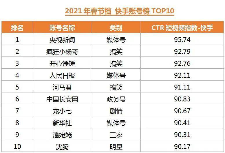 在快手平台,“央视新闻”以绝对优势领跑,“ 疯狂小杨哥”“开心锤锤”分别位列二、三位。TOP10账号集中于媒体号、搞笑类账号。