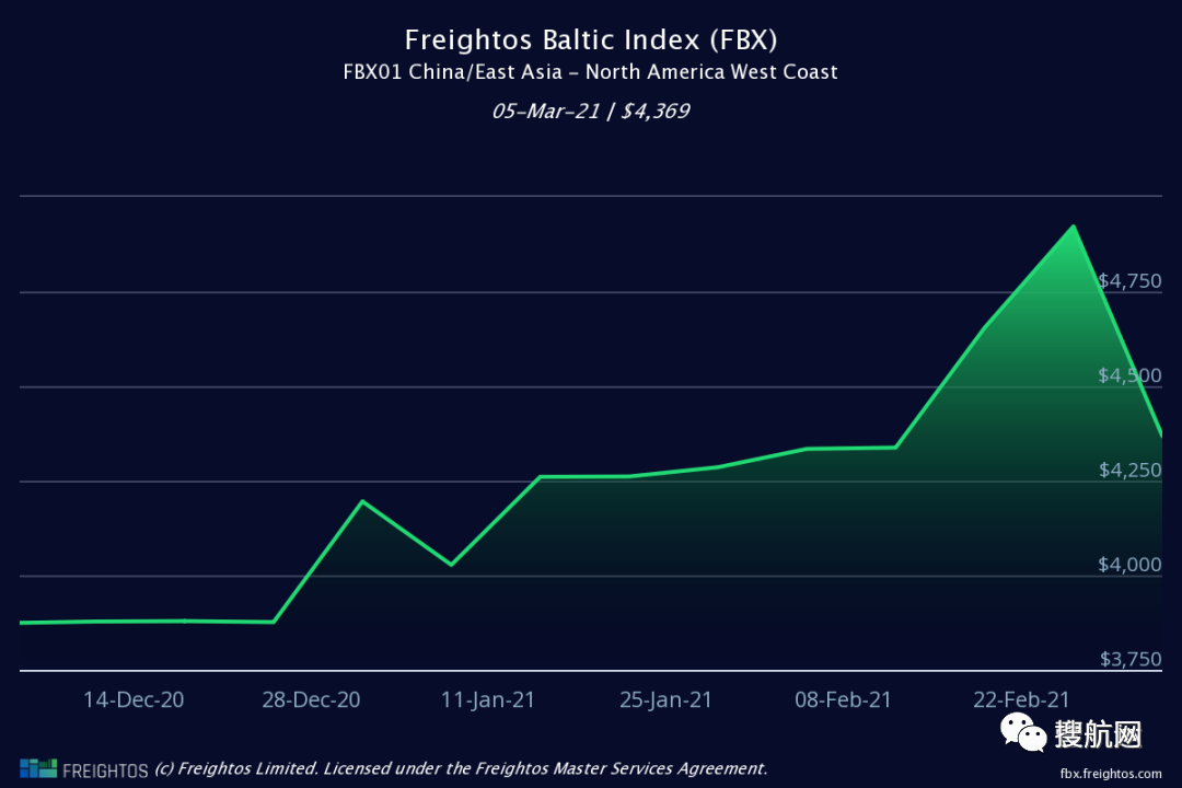 同时,根据Freeghtos波罗的海指数,自2月底以来,亚洲以外的运费有所下降,太平洋东行的即期运费从2月26日的高点4,922美元/ FEU降至3月4日的4,197美元/ FEU 。然而,到3月5日,即期运费再次飙升至4,709美元/ FEU。
