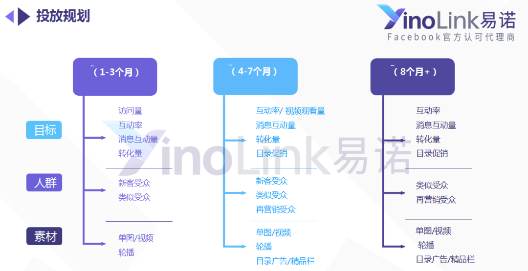 做facebook广告推广时,在不同的阶段,要针对性的选择广告目标,这样你的Facebook广告账户才能更好积累数据,机器才能更好达成广告目标,YinoLink易诺首席优化师 Nicole 给大家总结了在不同阶段应该选择怎样的广告目标、广告受众、广告素材,希望这个投放规划也能帮到各位卖家朋友。
