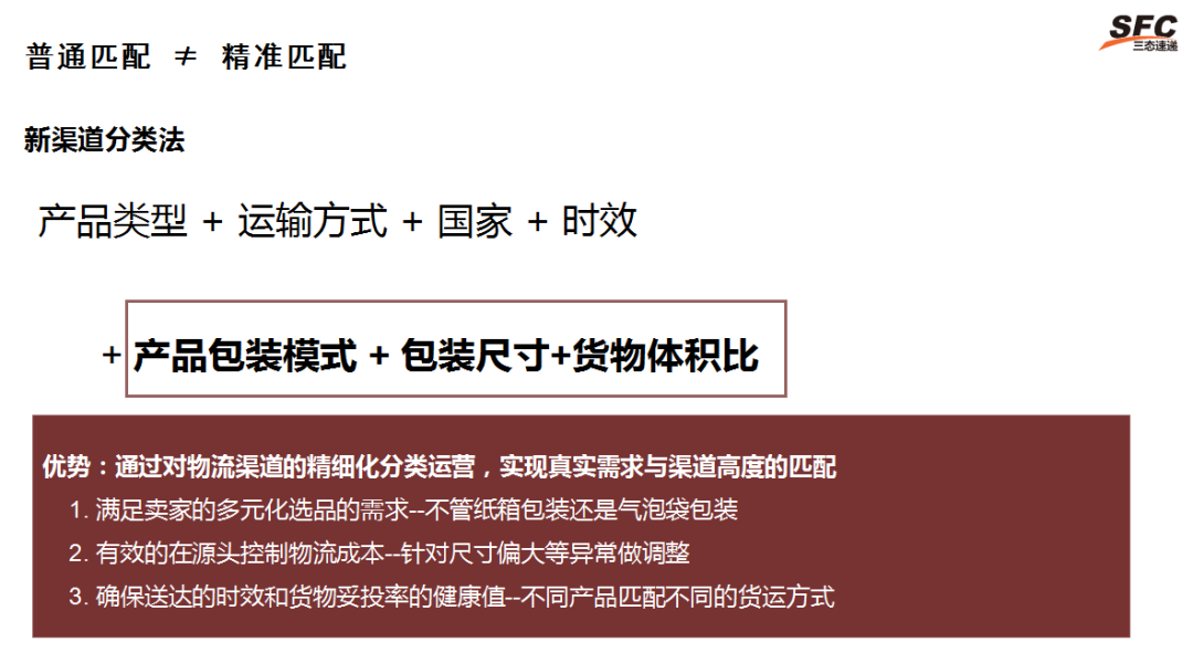 他还指出,独立站物流存在申报不合理、妥投率低而导致售后成本增加等问题,三态速递的业务经理Evan分享了物流的新渠道分类法,新渠道分类法:产品类型 + 运输方式 + 国家 + 时效,通过对物流渠道的精细化分类运营,实现真实需求与渠道高度的匹配。