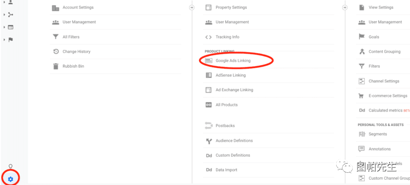 第一步必需把Google Analytics和Google Ads帐户连起来,打开你的Google Analytics帐户,先按左下角 Admin ,在Property中再按Google Ads Linking,记得Google Ads和Google Analytics的帐户必需是相同的邮箱