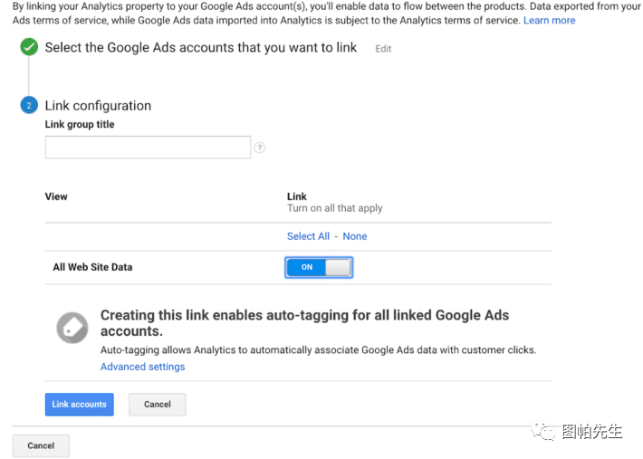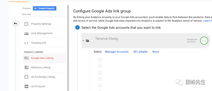 步骤2: 按下 +New Link Group,你会看到相关的Google Ads帐户,再它打勾然后再按Continue,然后Share “All Website Data”,再选Link Account,这样你己经把Google Ads和Google Analytics的帐户连好