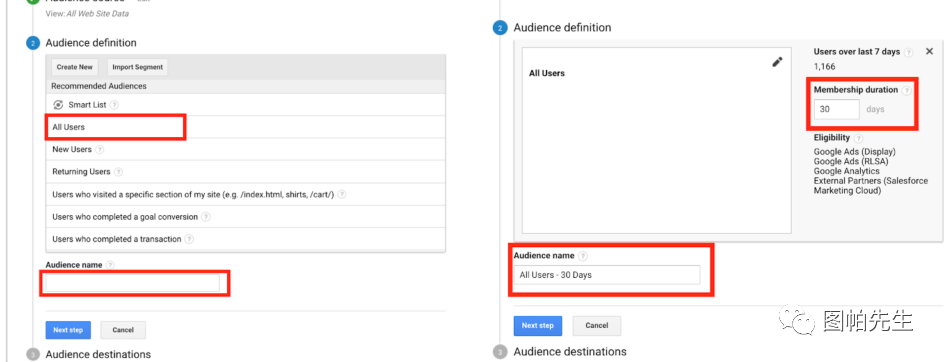 步骤4: 在这例子中选择All Users,然后在Membership Duration中选择30 Days,这是代表这个Audience List所读取的人数,记紧必需把Audience Name设定好,再选择这个Audience List的Destination,那当然是相应的Google Ads帐户!