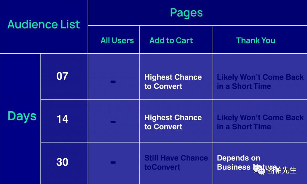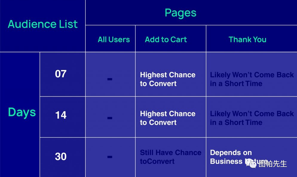 如果某受众己经进入了Add To Cart的页面但未到Thank You Page的话,这一类7 – 14 天的受众其实还有很大机会回来购买;