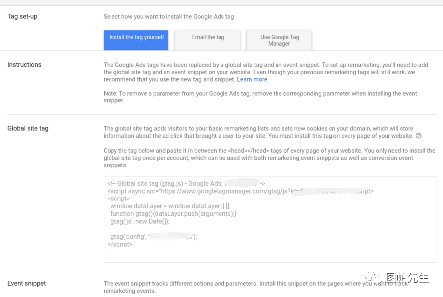步骤4: 按照你的情况,把Google Ads Tag 放到你的网站内。如果完全不明白,就直接挑“Email the tag”把代码发给你的Developer
