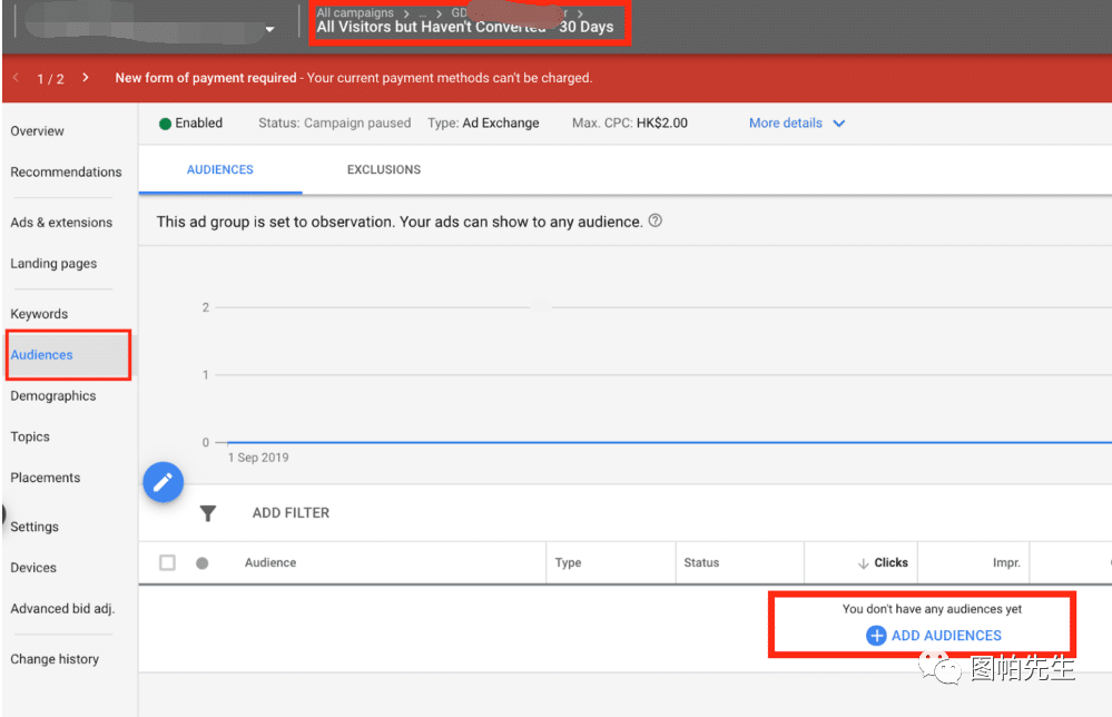 步骤2: 选定你的Display Campaign,Ad Group我会命为 All Users But Have Not Converted – 30 Days,大概是这样去分辨各个Ad Group中的受众。然后按Audience,再按 + Add Audiencess,意思是这个 GDN 的广告是Target某特定的Audience List
