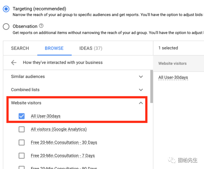 步骤4: 之后你会看到Similar Audience, Combined List和Website Visitors,当然这是再营销广告所以选择Website Visitors,之后你会看到你己经在Google Analytics中设定好的Audience List,在这个例子,先把All Users (All Visitors) – 30 Days加到Targeting中,然后按Save就完成建立再营销广告了