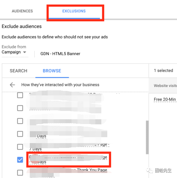步骤5: 当然,一个完整的再营销广告千万不要忘记Exclusion——排除不需要的人,最简单的是就把Thank You Page购物完成页面的Audience List做排除,意思就是这个广告是Target所有曾经游览网站的人,但广告不会投放给已经购买了的受众