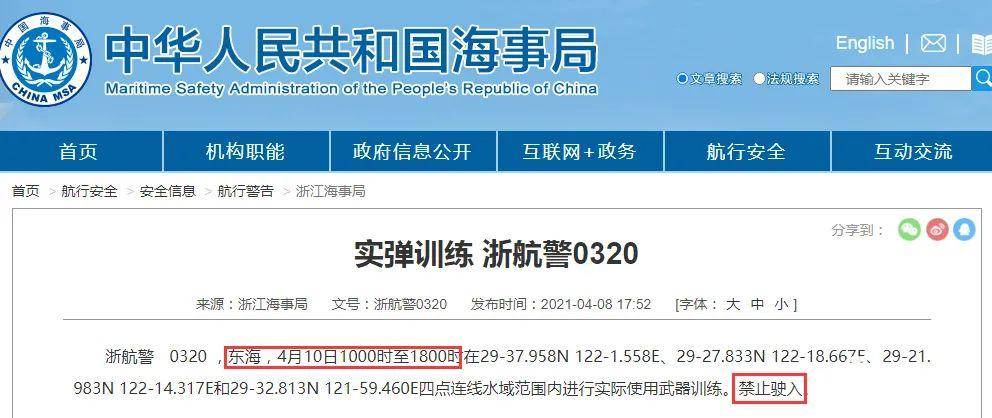 据浙江海事局消息,东海,4月10日1000时至1800时,在
