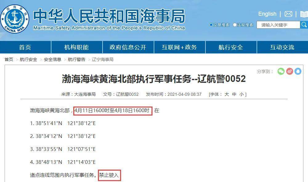 据大连海事局消息,渤海海峡黄海北部,4月11日1600时至4月18日1600时,在