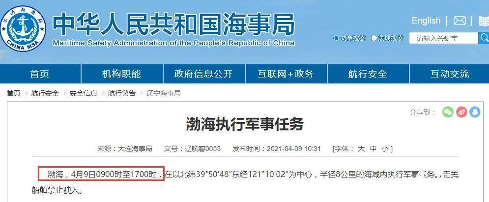 据大连海事局消息,渤海,4月9日0900时至1700时,在以北纬39°50′48″东经121°10′02″为中心,半径8公里的海域内执行军事任务。无关船舶禁止驶入。