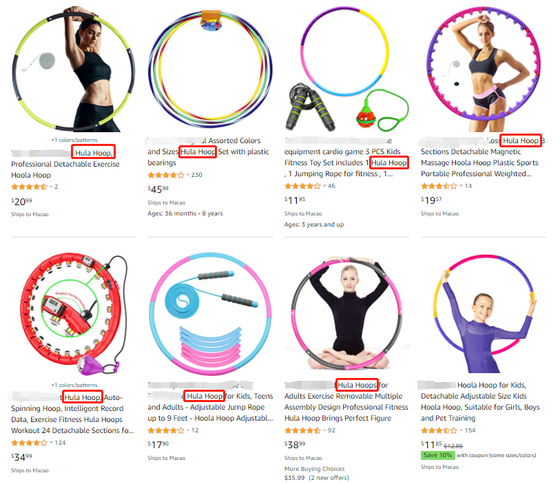 HULA HOOP(呼啦圈)是卖家常用的关键词,大家都以为是无害的产品词,谁曾想竟是注册商标。在品牌发案维权前,亚马逊上随处可见“HULA HOOP”。