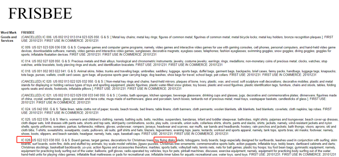 飞盘的英文单词就是Frisbee,卖飞盘产品经常会用到。这样的一个单词注册成商标,同行自然要“遭殃”。