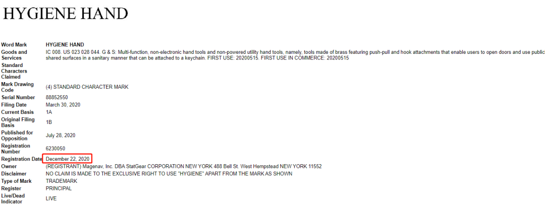 一款多功能的防病毒开门器,疫情期间卖得十分火爆。Hygiene Hand=卫生手,很多卖家都以为是产品描述词,没把它当成商标看待。