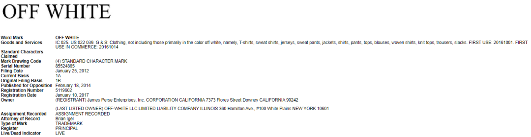 off-white(米白色)是一个颜色形容词,不具有显著性,一般而言不能作为商标使用。但事实上,它却是一个真实存在的美国商标,且注册类别众多。