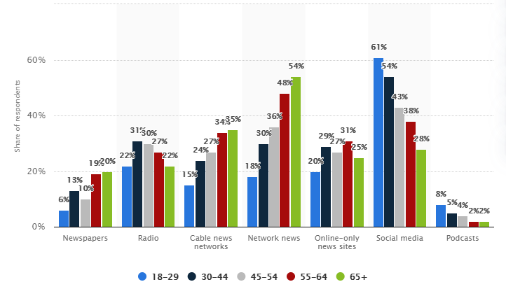 图注:截至2020年3月,按年龄段划分,美国最受欢迎的新闻消费平台(来源:Statista)