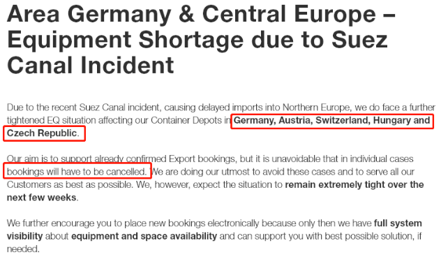 此前马士基曾表示,事件造成的延误可能会在未来几周内影响20%到30%的运力,决定暂停部分短期在线订舱,尽管随后不久恢复了预订。此外,4月1日赫伯罗特也发布公告称,北欧地区–大西洋西行临时暂停订舱。不仅如此,由于欧洲部分地区正面临着严重的集装箱短缺,即使已确认出口订舱,也有可能被取消。