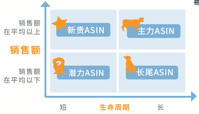作为已经步入成熟期的单品牌卖家,就需要考虑如何利用广告工具,为品牌下的产品实现分级。那么该如何给产品分级呢?下面的ASIN矩阵就能帮助卖家将所有商品根据销售额和周期分成四类:新贵ASIN、潜力ASIN、主力ASIN、长尾ASIN。
