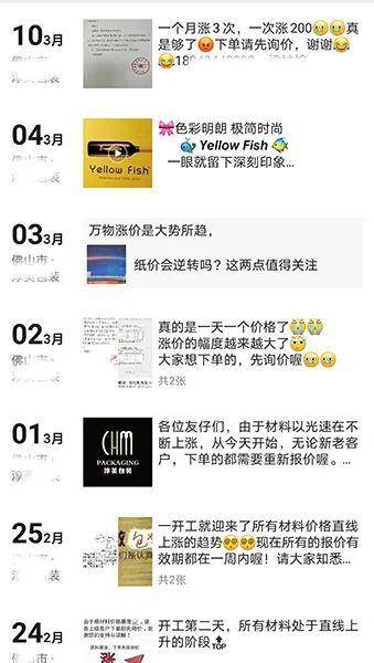 佛山市一家包装制品厂工作人员在这两个月里频频在朋友圈发布涨价消息。