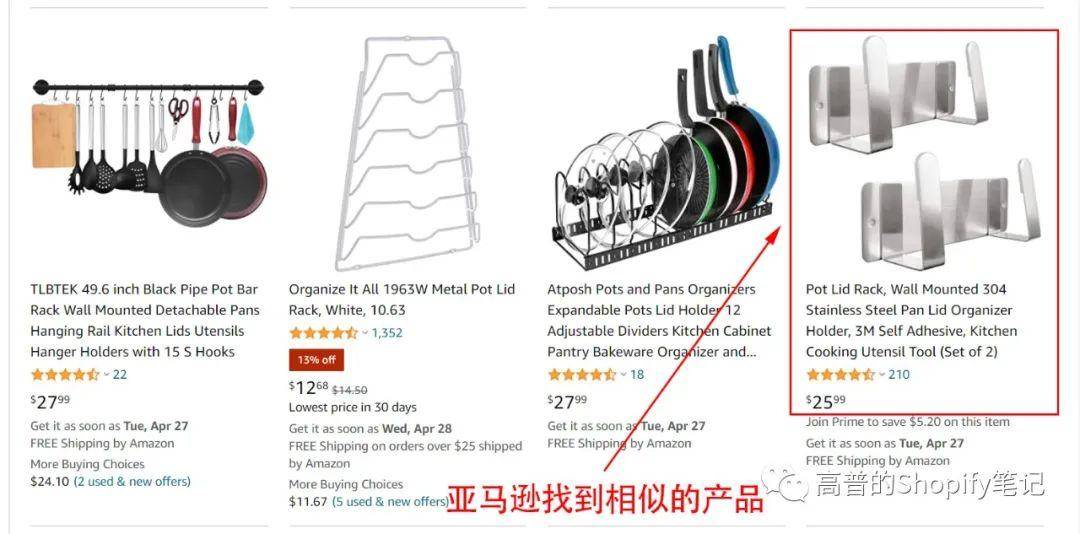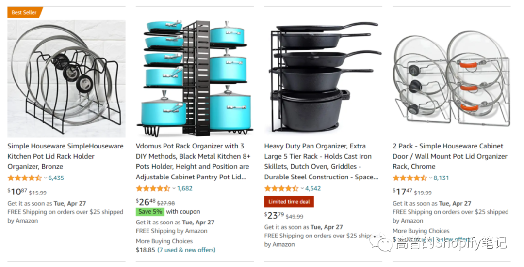 然后,通过亚马逊搜索"pot and pan organization",找到相似的产品线。