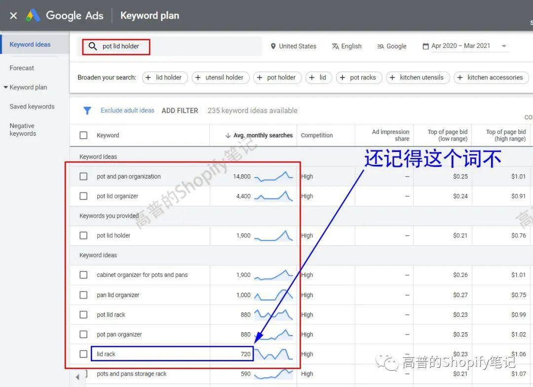 接下来将找到的关键词"pot lid holder"放到Google Keyword Planner进行联想。