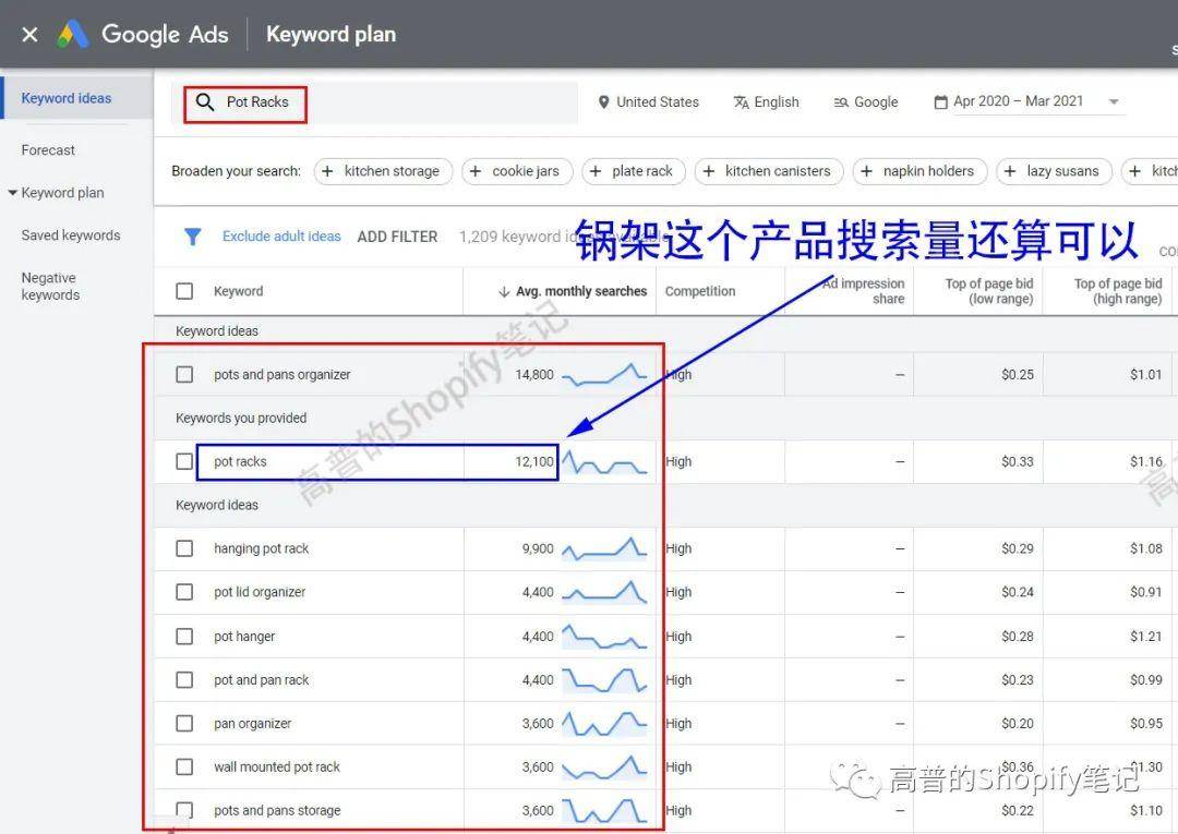 接下来,同样,将关键词"Pot Racks"放到Google Keyword Planner进行联想。