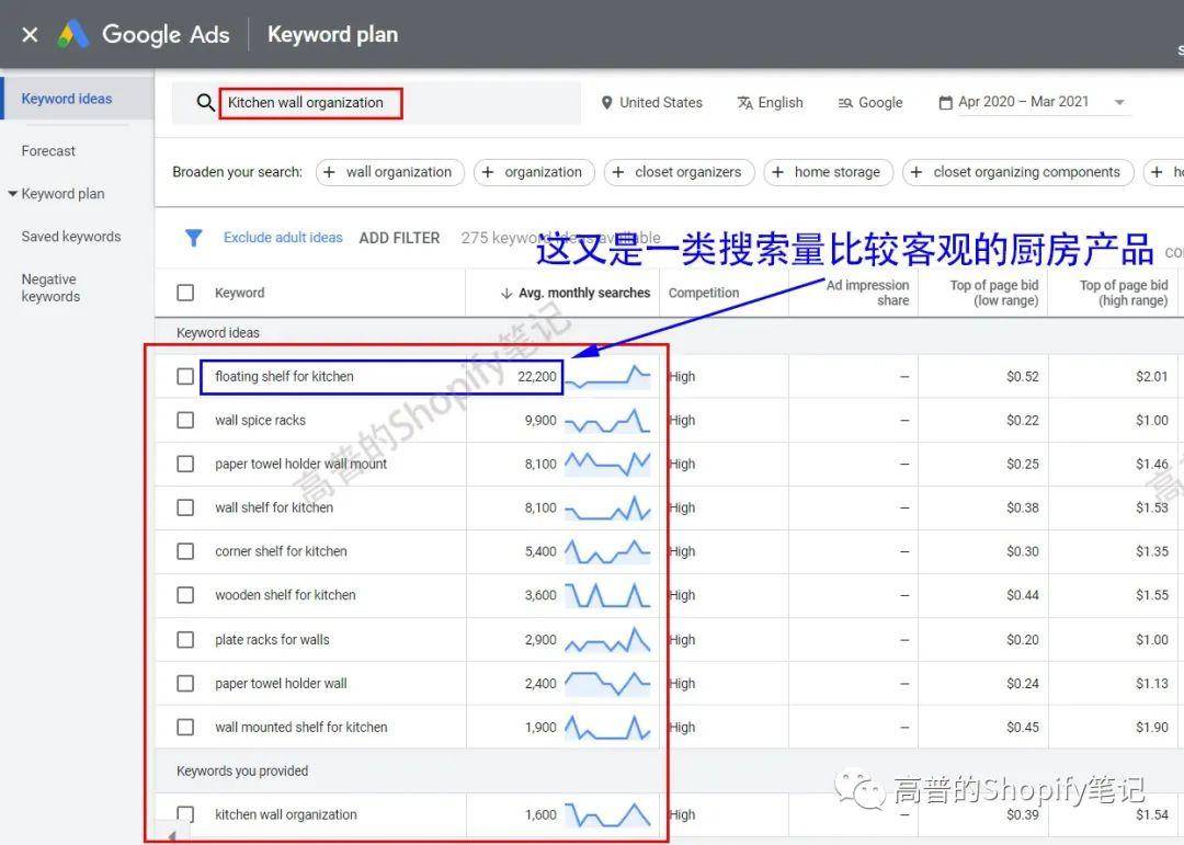 这里,我们用类目标题"Kitchen wall organization"作为关键词放到Google Keyword Planner进行联想。