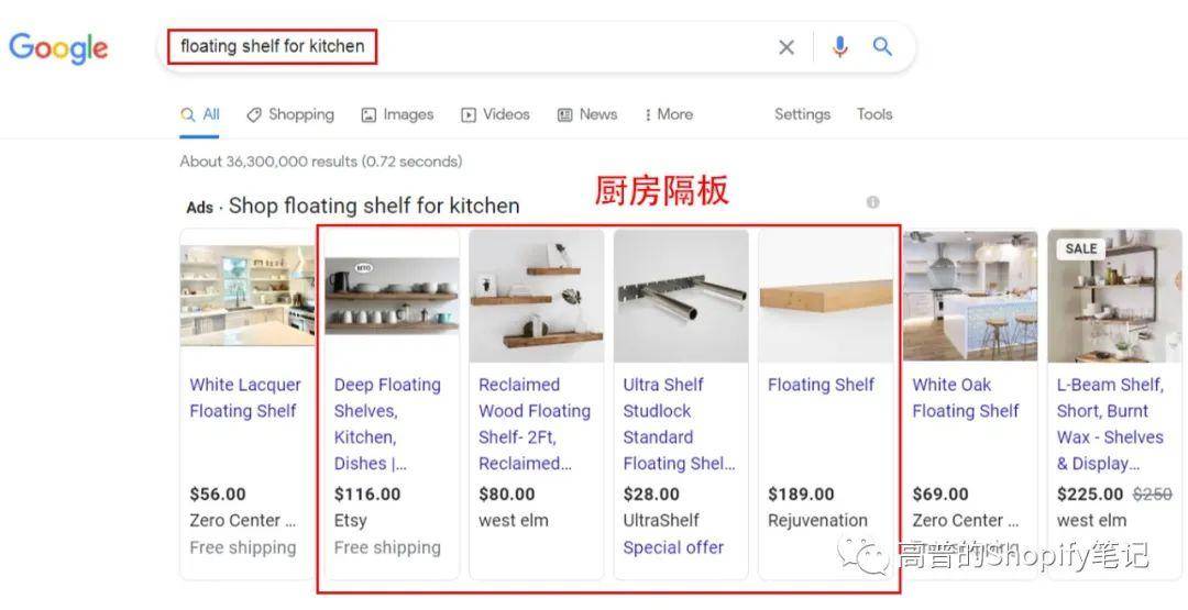 如果不清楚"floating shelf for kitchen"具体是指的什么产品,就放到google shopping里查下。