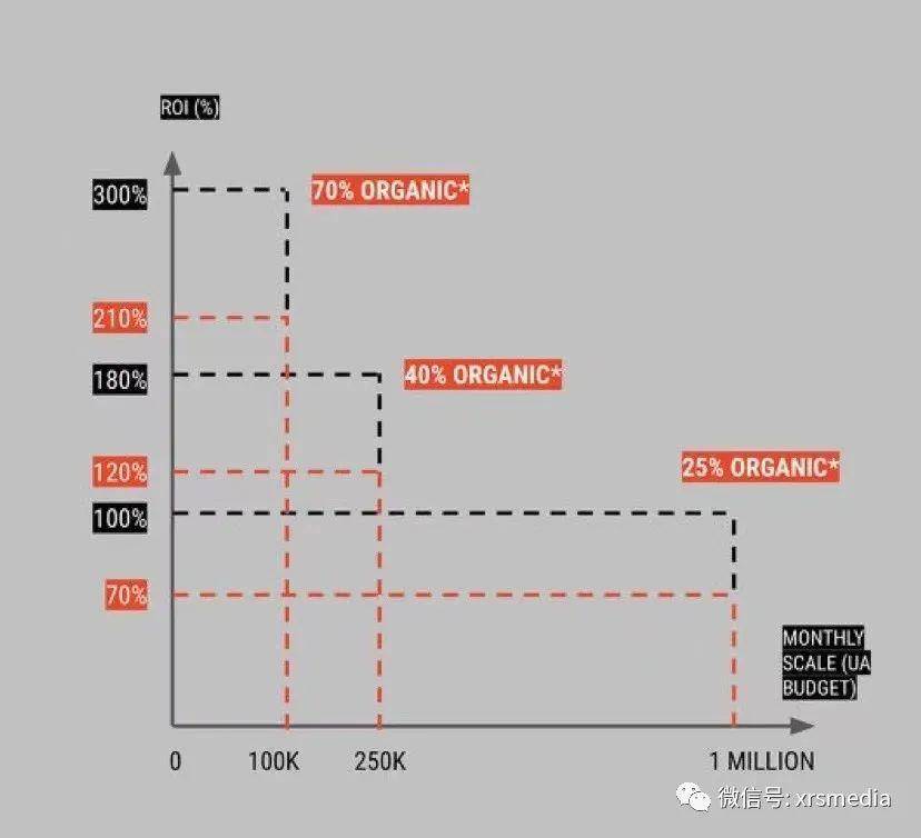 在上图中,X轴是每月规模,指的是每月买量预算,Y轴是ROI比例。上图中的自然新增比例是不同买量规模当中的自然新增安装量比例,这个比例通常会在手游厂商增加买量预算和安装量的时候降低。