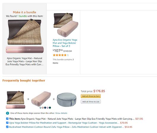 不同于“经常一起购买”功能,虚拟捆绑不是系统自动生成的,可以由卖家自主组合,但每个组件的ASIN必须可单独购买,并且确保组件的相关性。比如:瑜伽垫和瑜伽枕、电视机和电视机支架、运动上衣和运动裤,或多种儿童洗澡玩具的组合等。