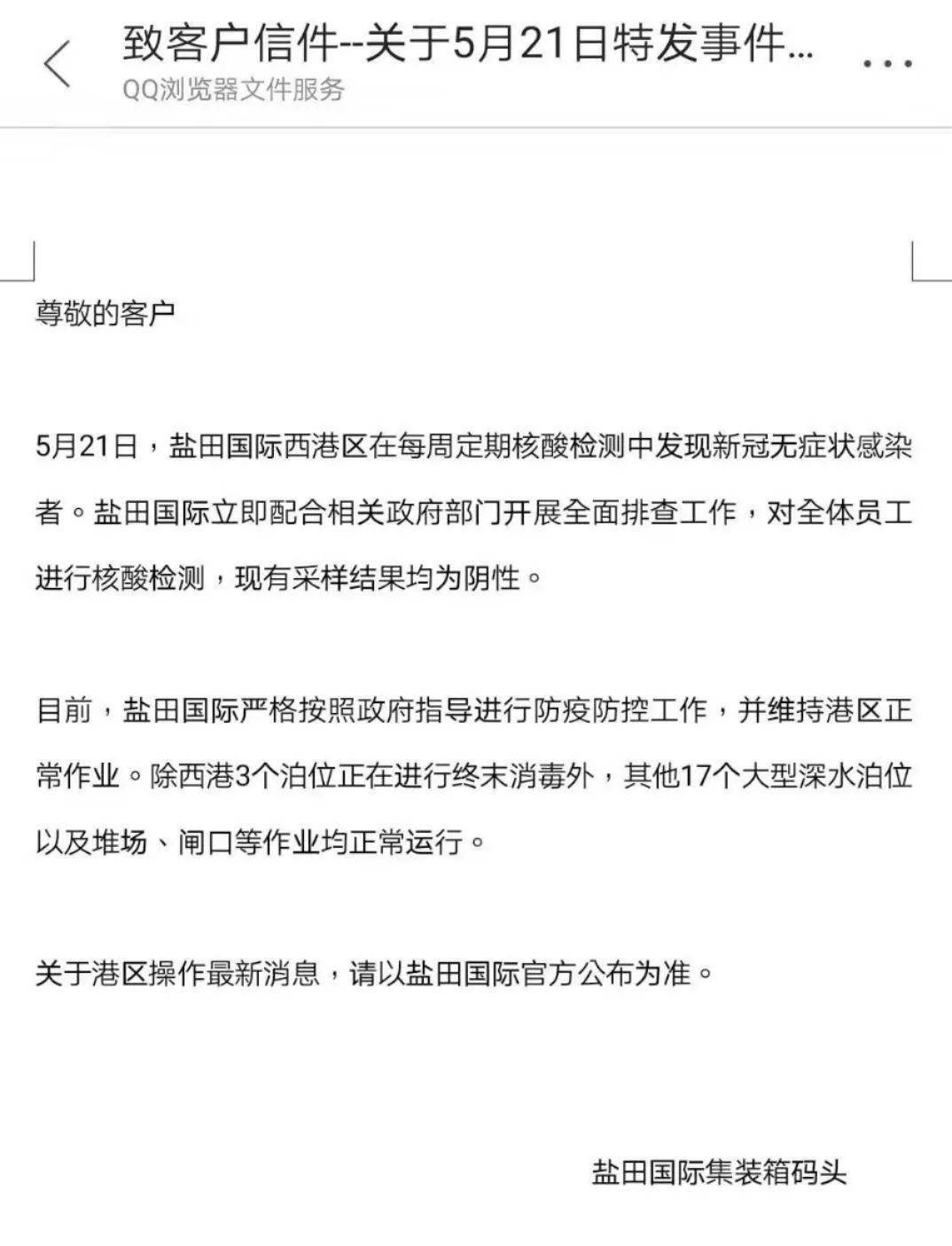 5月21日,盐田国际西港区在每周定期核酸检测中发现新冠无症状感染者。盐田国际立即配合相关政府部门开展全面排查工作,对全体员工进行核酸检测,现有采样结果均为阴性。