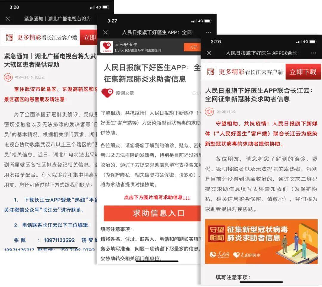 长江云平台开通了征集新冠肺炎求助者的功能,提供在线义诊服务,充分体现了媒体在危急时刻的责任担当。当时有300多名记者走访各个小区征集求助者,力求帮助到每一个需要帮助的患者。据统计,超过6500名患者通过长江云融媒体平台得到救治,而每个患者背后都是一个家庭。