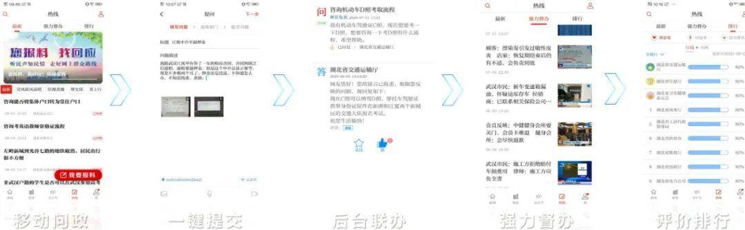 图注:用户通过“移动问政”“一键提交”“后台联办”“强力督办”“评价排行”这几个步骤进行线上问政