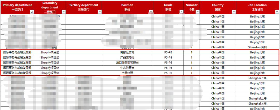 根据上述文件,京东“国际事务与战略发展部”(一级部门)下属的“Shopify项目组”,正在进行招聘。具体岗位包括商家运营、产品策略、出口服务商管理、生态管理、产品经理等,工作地点为北京。