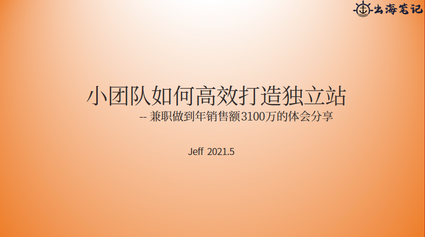 大家好,我是Jeff,我今天想分享一个题目,小团队怎么样去高效的打造独立站,兼职做到年销售额3100万的一个体会。