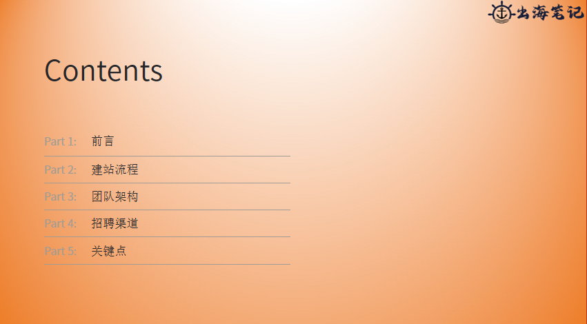 我会先说一个简单的前言,然后是建站我们中间使用流程大概的描述一下,然后是团队的架构——其实我觉很多事情,具体的打法是一方面,但是其实一些支撑的系统也非常的关键,所以比如说像团队架构也特别重要,人是特别重要的,得做一个项目无非是事和人两方面。