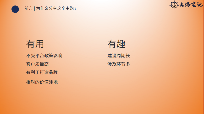 独立站因为它不受平台政策影响。客户质量相对比较高,也有利于打造品牌。相对来说它是个价值的洼地,那么这一点其实我想多说两句,就是一个事情它越有门槛,他就越有价值或者越有利润。